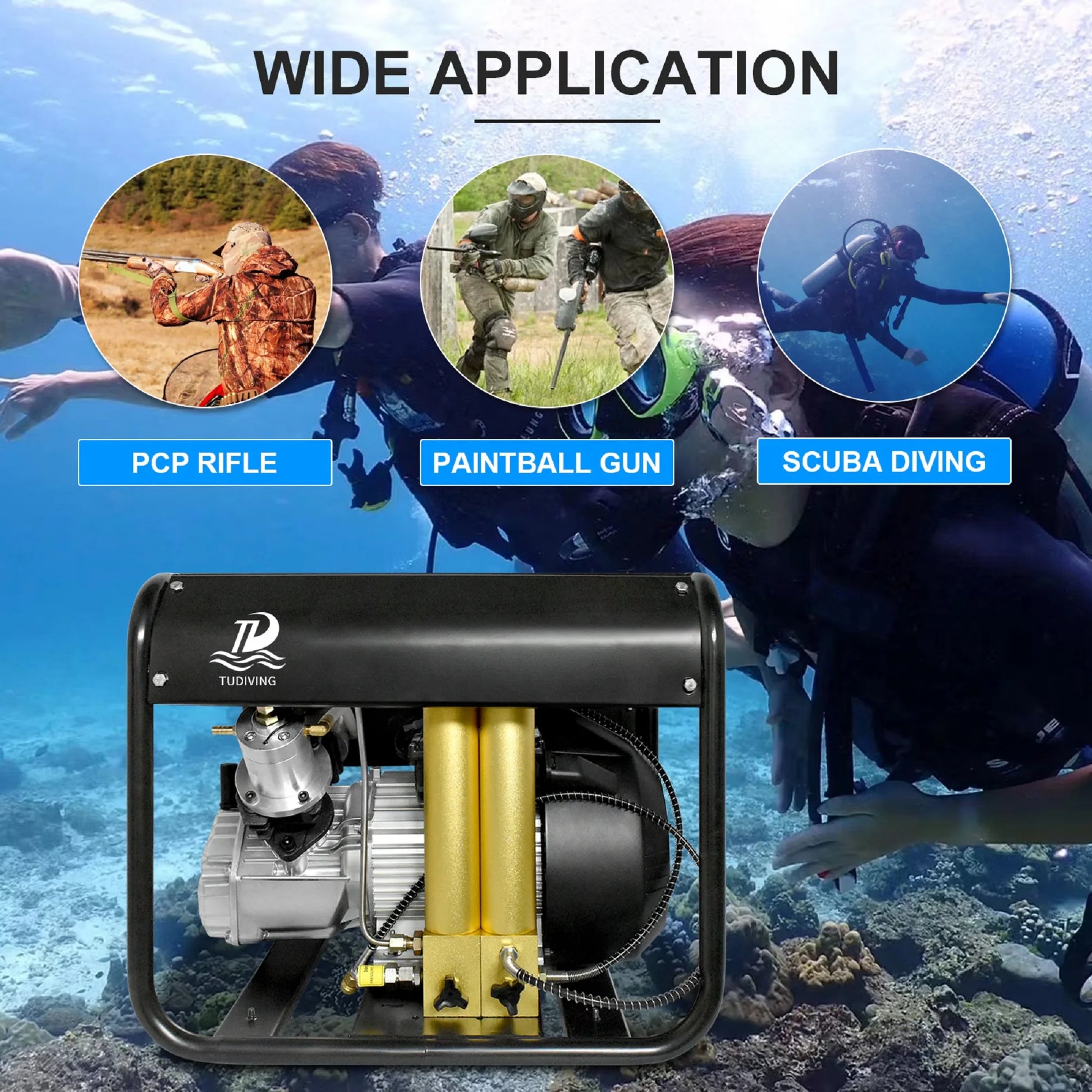 【Product Specifications】: TUDIVING This PCP air compressor is equipped with 110v power supply and can be used with household power supply. Working pressure: 30MPA/300bar/4500psi, flow rate: 40L/min, power: 2.2kw, frequency: 60Hz, very suitable for large-capacity bottle filling, filling a 0.5 liter water tank from 0-300 bar takes about 3 minutes, from 0 bar to It takes approximately 45 minutes to fill a 6.8 liter water tank at 300 bar.
